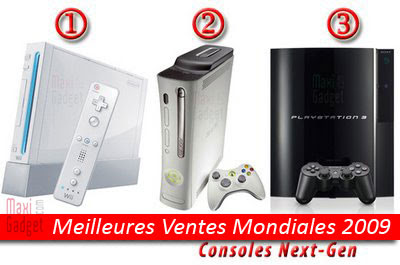 L’heure est venue de faire un nouveau bilan des meilleures ventes mondiales de consoles de jeux video Next-Gen. Après le récent chiffre communiqué par Microsoft, qui bat des records, voici donc sans surprise le nouveau TOP CONSOLES 2009 (qui inclut toutes les ventes jusqu’au mois de Mai 2009).- Nintendo Wii : 50,4 millions de consoles vendues,