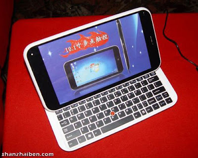 Les copies Made in China de la tablette Apple continuent d’affluer, mais tous ne cherchent pas à faire du copier/coller. Preuve en image avec ce modèle qui tire plus son inspiration des smartphones, en intégrant un clavier coulissant QWERTY à l’iPad. Au final, on quitte l’univers des tablettes pour replonger dans l’univers des netbooks. Pas si futé que çà !!!
