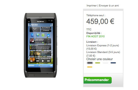 Après un bref rappel le 29 juillet sur le prix et la date de sortie, je vous confirme que depuis quelques heures, le Store Nokia France affiche le Nokia N8 en pré-commande à 459 euros débloqué et en plusieurs coloris. Livraison pour la fin Août. Retrouvez tous les détails (fiche technique, photo, video) sur ce nouveau smartphone 2010, ICI.