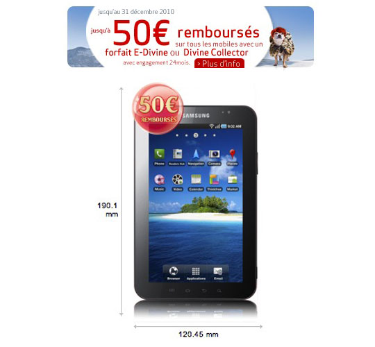 Juste une petite note pour vous signaler que la Galaxy Tab est actuellement disponible à petit prix chez Virgin Mobile. Pour seulement 199 euros (249€-50€) et un abonnement téléphonique annuel Forfait Divine 4h, vous repartirez avec la nouvelle tablette Samsung sous Android qui vous propose un écran tactile 7″, avec processeur 1Ghz, APN 3.2Mp, capture video HD, GPS, mémoire 16Go extensible, prise jack 3.5mm, connectivités WiFi, Bluetooth et support 3G+.
