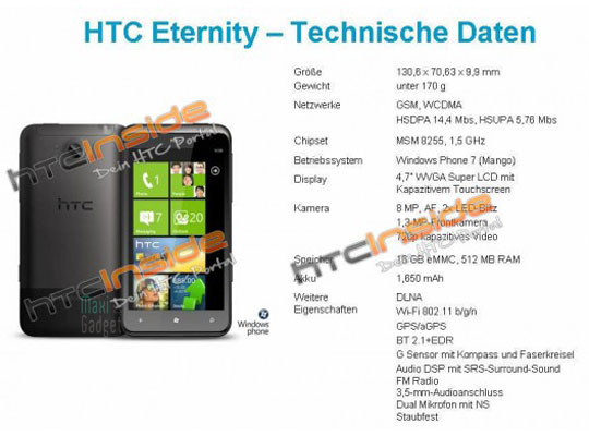 L’annonce d’un nouveau HTC Eternity nous vient du site HTCinside, qui vient de faire quelques révélations croustillantes sur ce Superphone sous Windows Phone 7.1 Mango, dont voici la fiche technique complète:
