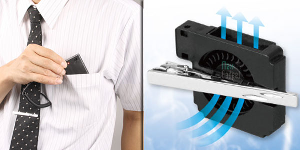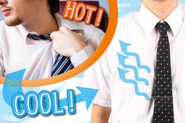 Porter une cravate en plein été c’est limite désagréable. Pourtant certains ne peuvent pas faire autrement, c’est pourquoi Thanko commercialise une pince cravate à air conditionné. Fournie avec un mini ventilateur, elle fonctionne via USB ou plus simplement avec deux piles AA. Pour passer inaperçu, il suffit de glisser le ventilo dans la poche de la chemise, et laisser agir.