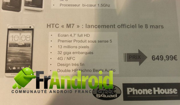 Selon nos confrère de Frandroid, le HTC M7, annoncé depuis le 3 janvier sur la feuille de route 2013, est confirmé par l’opérateur Phone House avec prix et fiche technique à l’appui. Le Super Phone est attendu pour le 8 mars au prix de 650 euros nu, et probablement à 199 euros avec abonnement. En attendant la confirmation officielle du fabricant prévu pour ce 19 février, découvrez dans la suite tous les détails techniques du HTC M7.